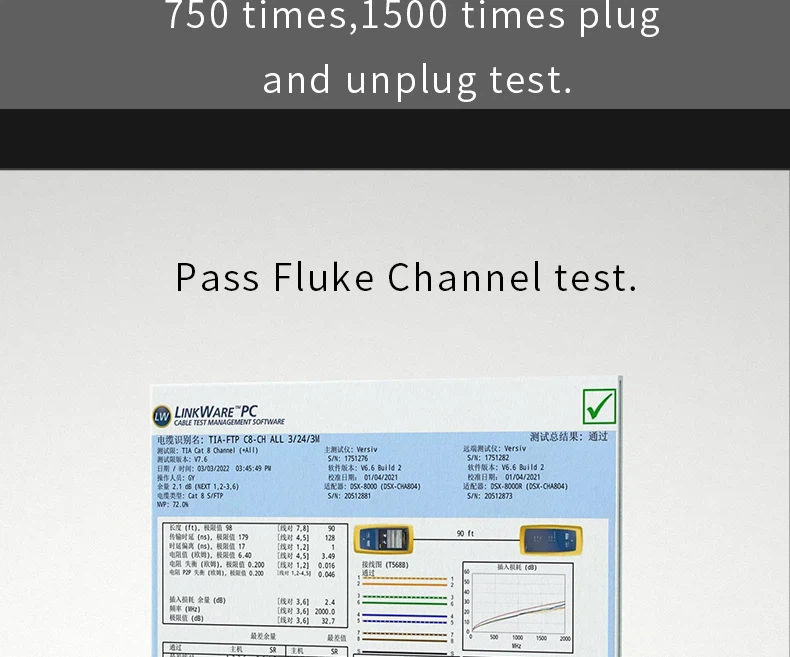 2. The highest performance in the industry. Pass the component test(much harder to pass than Fluke Test). Pass the standard test of ISO/IEC (EU standards) and TIA/EIA(US Standards).